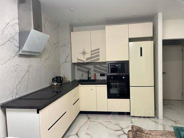 Просторная кухня с мебелью и техникой: холодильник, микроволновка, индукционная панель, духовой шкаф, чайник.