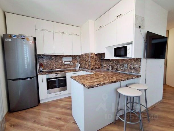 В кухне-гостиной: кухонный гарнитур с островом, холодильник, посудомоечная машина, духовка, вытяжка, обеденный стол и 2 стула, микроволновка, чайник, диван. В одной из спален двуспальная кровать, платяной шкаф, комод с зеркалом и полками, пуф; во второй спальне раскладной диван и остаётся место для размещения дополнительной мебели на усмотрение арендатора. В прихожей удобный и вместительный шкаф-купе, есть wi-fi роутер, в ванной комнате стиральная машина и шкаф для хранения мелочей. На балконе тоже есть диванчик.