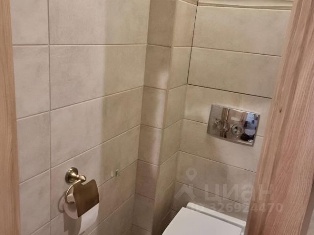 Санузел раздельный, с удобной системой хранения. В ванной современная плитка, установлена качественная сантехника, удобная раковина с тумбой и подсветкой.