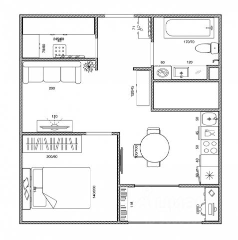 При входе расположен глубокий встроенный шкаф для хранения сезонных вещей. Грязная зона удачно отделена от всей квартиры, что обеспечивает чистоту дома.
