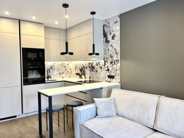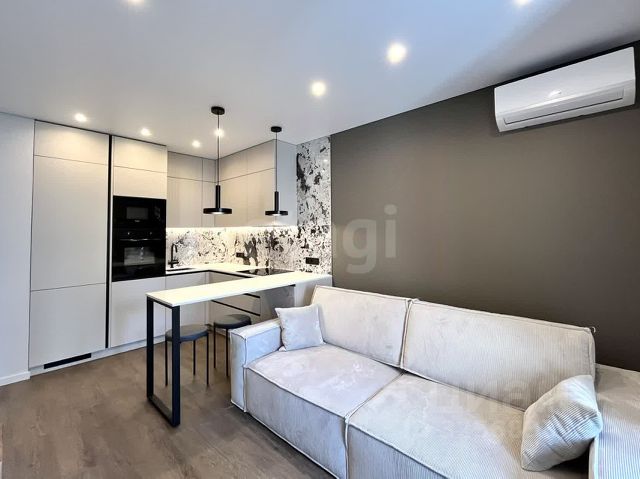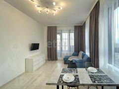 В квартире выполнен дизайнерский ремонт, что придаёт ей уникальный стиль и уют. Комнаты полностью меблированы, вся мебель встроена, есть вся необходимая техника: кондиционер, холодильник, посудомоечная машина, телевизор, стиральная машина. Два санузла :один при спальне, второй гостевой. В гостинной зоне для уюта встроен паровой камин.
