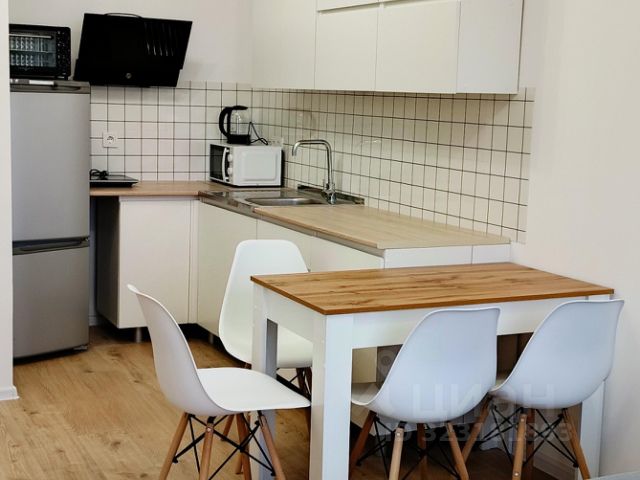В комнате мягкий раскладной диван, аккуратная стенка-горка. Установлен кухонный гарнитур, сделан фартук, обеденный стол - конструктор, электрическая плита, холодильник, микроволновая печь, стиральная машина, всё подключено.
