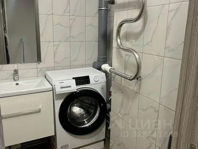 Ванная комната выполнена в кафельной плитке, здесь размещена душевая кабина, стиральная машина, раковина и зеркало. Вытяжка включается вместе со светом.