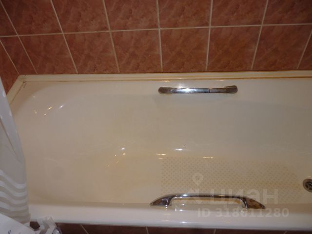 Санузел совмещенный, облицованный плиткой, с ванной, есть зеркало с полкой.