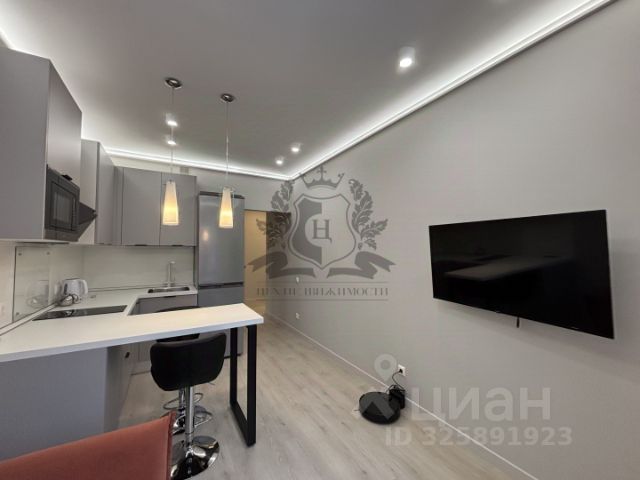 Современная кухня-гостиная с качественной мебелью и встроенной техникой: холодильник Haier, посудомоечная машина и варочная панель Bosch, духовой шкаф и СВЧ Whirlpool, измельчитель пищевых отходов In Sink Erator. В гостиной диван, большой smart-телевизор, саундбар Yamaha.