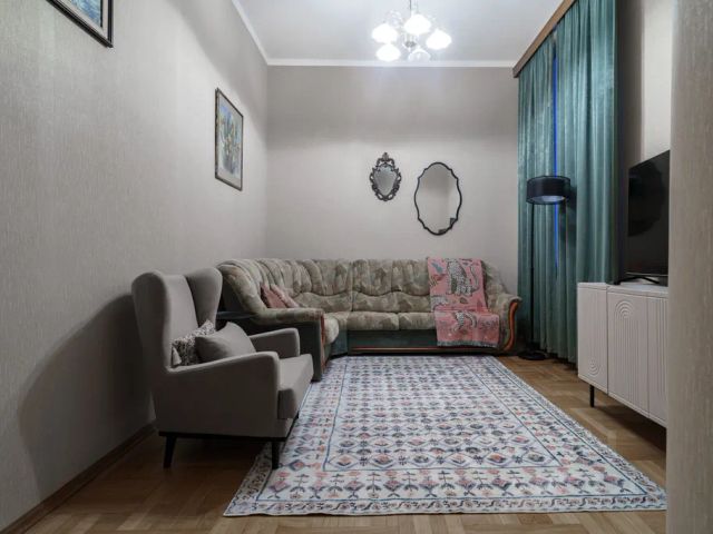 Апартаменты находятся в одноэтажном доме с отдельным входом и своей мангальной зоной. Спальня: 1 большая двуспальная кровать. В апартаментах находятся: 1 спальня 30м², кухня, санузел с душевой кабиной, посудой на 2х человек, микроволновкой, чайником, кофеваркой, плитой, холодильником, феном, тостером, туалетные принадлежности (мыло, шампунь), полотенца, халаты, ватные диски и палочки. На территории также имеются : мангал, гамак, качели