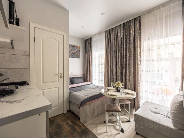Уютные апартаменты-студия с дизайнерским ремонтом, общей площадью 18 кв.м. с кухней-гостиной, зоной для отдыха, отдельным сан узлом и коридором.