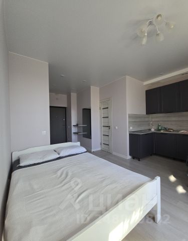 Солнечная студия в серых тонах, с большими окнами. Удобная планировка: просторная входная зона, встроеннный гардеробный шкаф, кухонный гарнитур, двуспальная кровать, стол, ванная комната с душем.