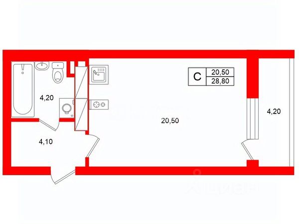 - Квартира-студия общей площадью 28,8 кв.м, просторная комната 20,5 кв.м с выходом на застекленную лоджию.