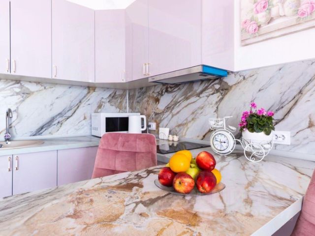 —> В апартаментах создана комфортная и уютная атмосфера, а планировка продумана таким образом, что есть место и для отдыха, и для работы.