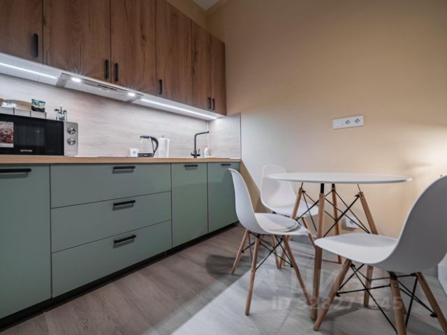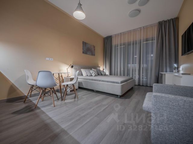 Студия 25 кв. м. Для удобства гостей кухня вынесена на застекленный теплый балкон, в комнате есть большая кровать и один раздвижной диван, стол со стульями, ТВ и торшер. Двуспальная кровать, гардеробный шкаф, стол со стульями, раздвижной кожаный диван, прихожая, кухня. Магазины, универсамы, кафе и рестораны.