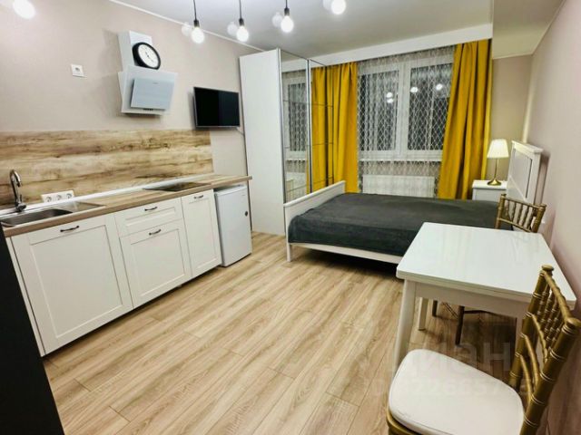 В студии есть все необходимое для жизни: кровать, рабочая зона, кухня с техникой, обеденный стол, шкафы, стиральная машинка, душевая и многое другое.