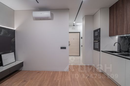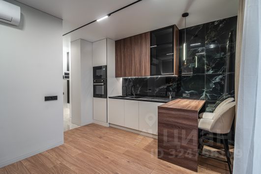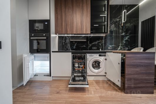 Встроенная кухня с керамической варочной панелью, вытяжкой, 2- камерным холодильником, Свч, чайником, посудой. Установлен фильтр очистки воды. Барный стол и 2 высоких мягких стула.