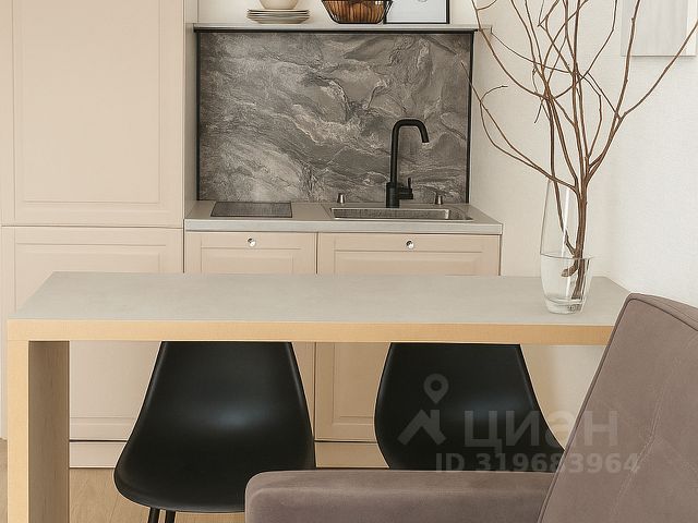 Кухонная зона: микроволновая печь, чайник, 1-конфорочная индукционная плита. Посуда, кухонные принадлежности также есть. Вместительный холодильник с морозильной камерой