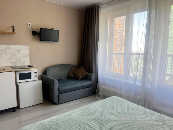 Солнечная студия в серых тонах, с большими окнами. Удобная планировка: просторная входная зона, встроеннный гардеробный шкаф, кухонный гарнитур, двуспальная кровать, стол, ванная комната с душем.