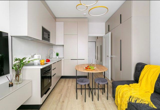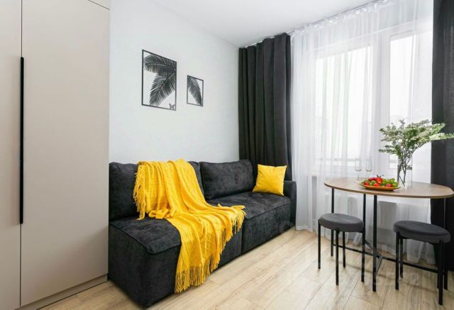 - Мебель: кровать на 2 спальных места, кухонный гарнитур, барный стол со стульями, мебель в ванной комнате и прихожей;