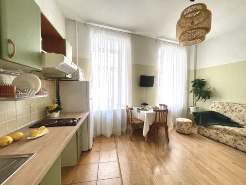 Квартира оборудована всем необходимым: прихожая, шкаф, обувница, санузел с душевой кабиной, застекленная лоджия, раскладной диван, комод, кухонный гарнитур с обеденным столом и стульями.