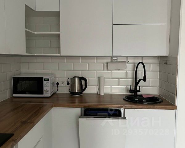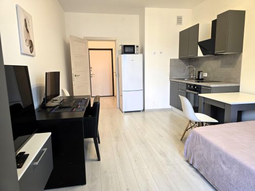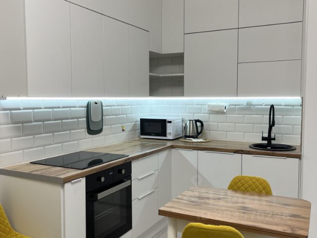 - Есть вся необходимая техника (духовой шкаф, варочная панель, вместительный холодильник с тремя отсеками морозильной камеры, микроволновая печь, электрический чайник);