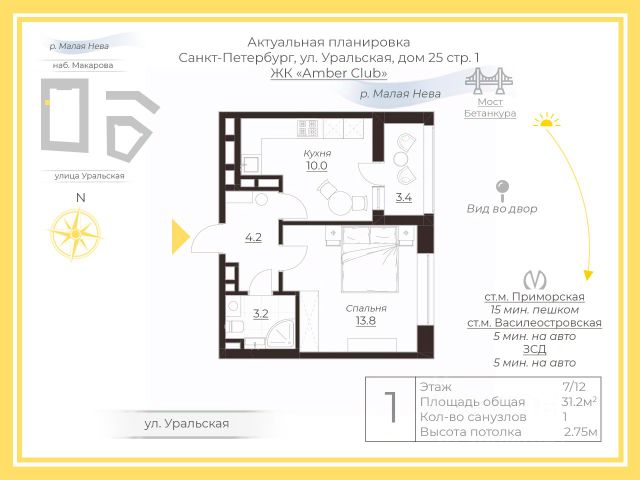 Рядом с домом остановка общественного транспорта (автобус) до метро "Василеостровская" 10 минут. Пешком до метро "Приморская" -15 минут, на авто - 4 минуты. Удобный выезд на ЗСД.