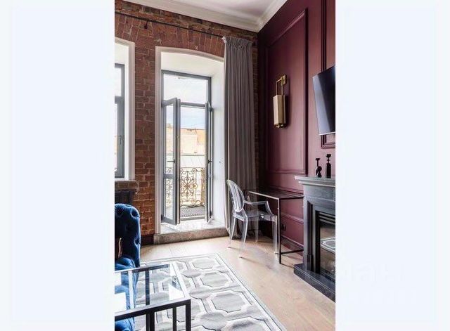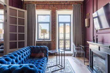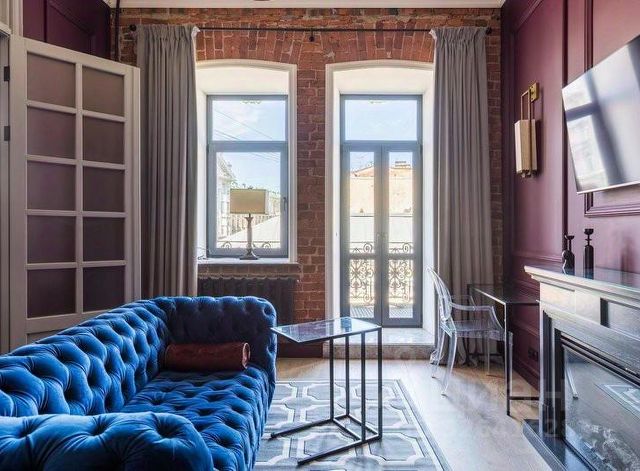 Атмосферная гостиная с уютным электро камином, смарт тв и видовым балконом.