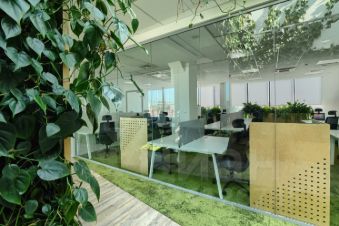 • Зону smart-офисов разной площади. Зонирование пространства выполнено стеклянными пе...