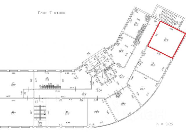 Находится на седьмом этаже. Кабинетная планировка из 5 смежных комнат.