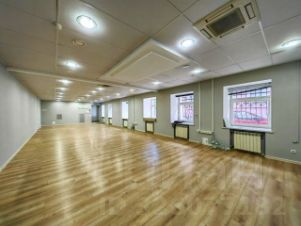 Большой зал порядка 80 метров, небольшая комната, которую можно использовать под кухню, раздевалку или подсобное помещение , санузел с душевой кабиной.