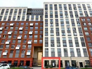 В густонаселенном спальном районе. 1, 2-й этаж 26-ти этажнoгo кирпичного здания 2009 года постройки по адресу Санкт-Петербург, ул. Есенина 1 к 1.