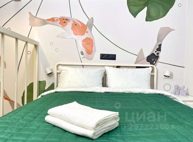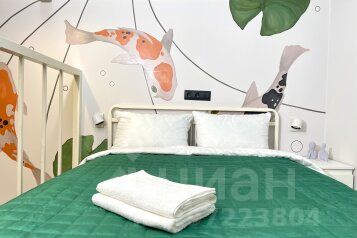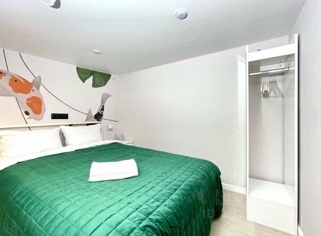 Площадь студии 15+5 м., первый этаж 15 м, второй 5 м. Спальных мест: 2+2 (двуспальный раскладной диван, двуспальная кровать). Студия двухуровневая, внизу расположен диван, а на втором ярусе кровать. Высота на втором этаже 150см. Собственный санузел: душ, туалет.