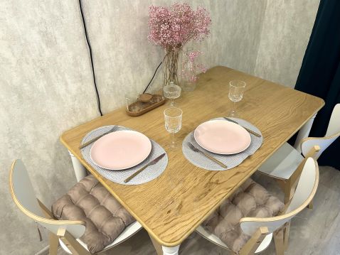 На кухне есть обеденный стол, который может использоваться как рабочее место. Рядом есть розетка и удлинитель.