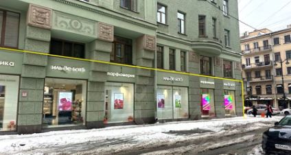 Первая линия проспекта. Высокий пешеходный и автомобильный траф...