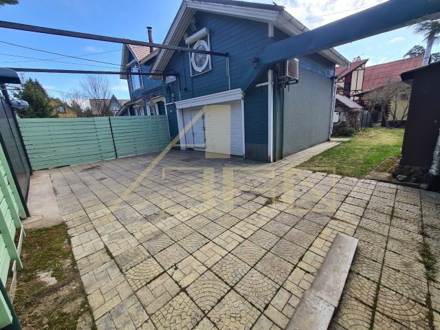 На участке (5 соток) есть навес для автомобиля, выложена брусчатка, есть небольшой ландшафтный уголок. Терасса под навесом в стиле дома, с мебелью из ротанга, гриль-мангалом, подвесным креслом. По периметру забор (штакетник шахматный) с откатными воротами.